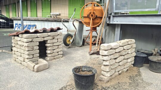 Unser Außengelände bietet eine „echte“ Baustelle an, mit Mauersteinen, Dachziegeln und Dachgestellen zum Errichten von kleinen Häusern. Helm, Kelle und Handschuhe werden bereitgestellt, damit junge Bauarbeiter*innen richtig loslegen können. Steine schleppen, Sand herbeischaffen, Mörtel anrühren – aber kräftig! Kurzum, es ist eine Menge schwere Arbeit zu erledigen, bevor das Haus steht.